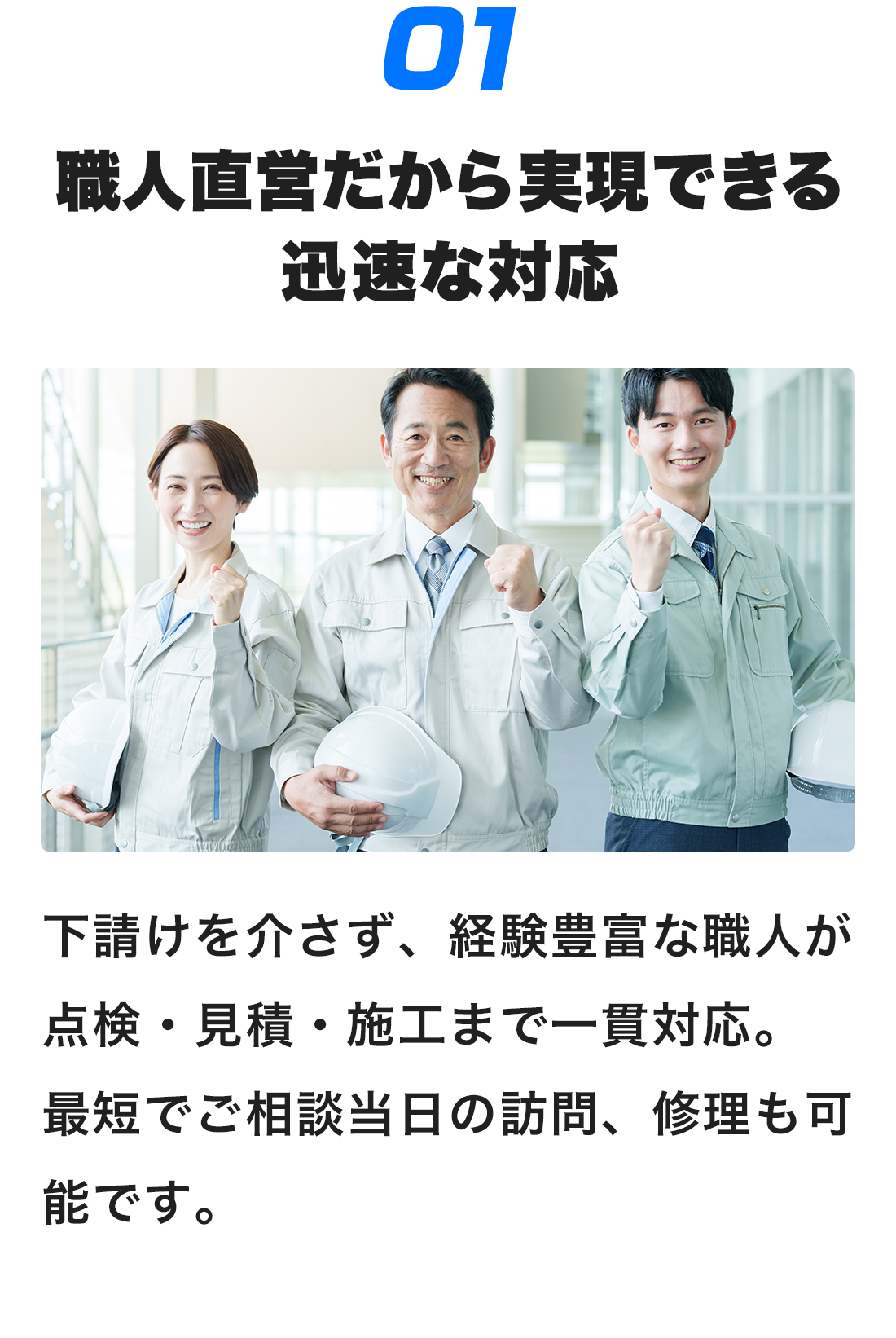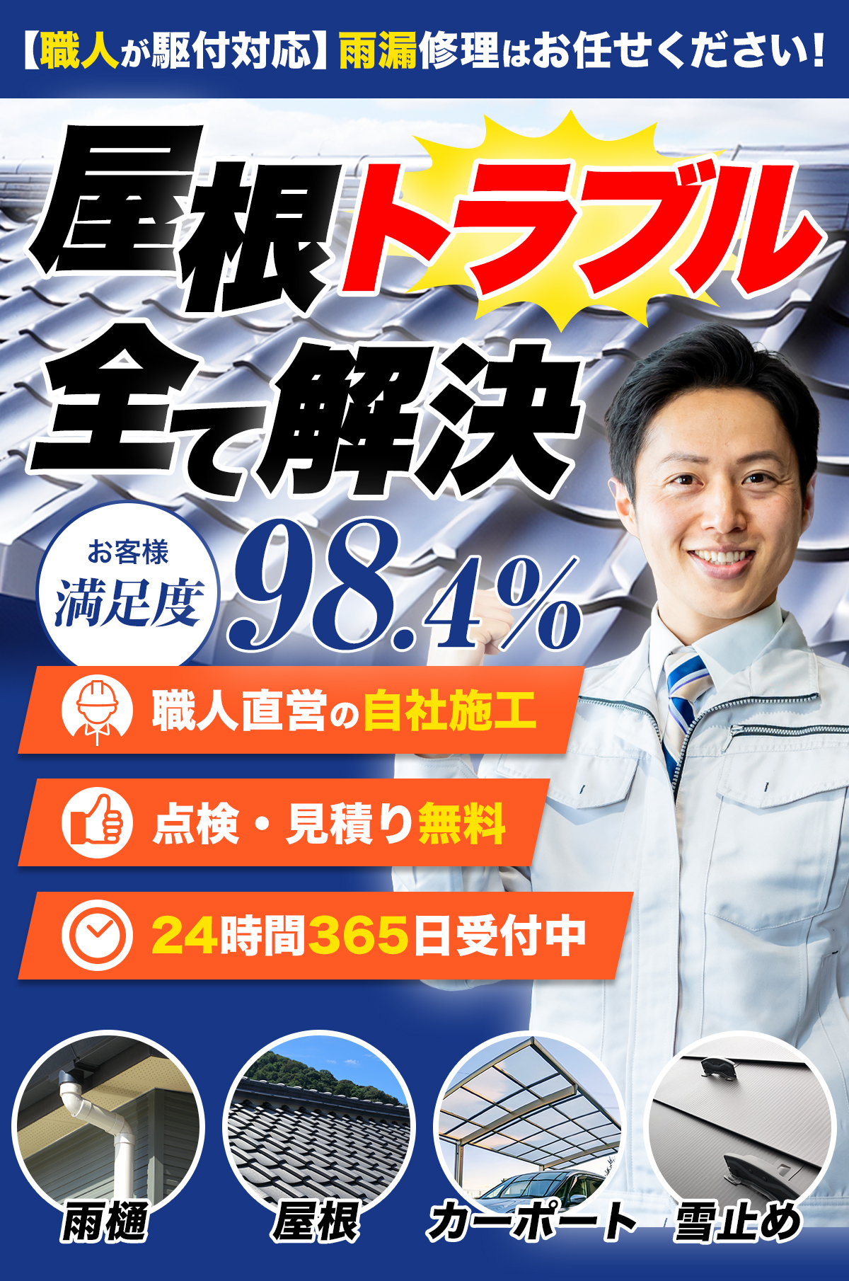 はい。積雪後の被害確認や応急処置も対応しています。ただし安全のため、雪が解けた後の本格修理をおすすめしています。緊急時は当日または翌日に訪問いたします。