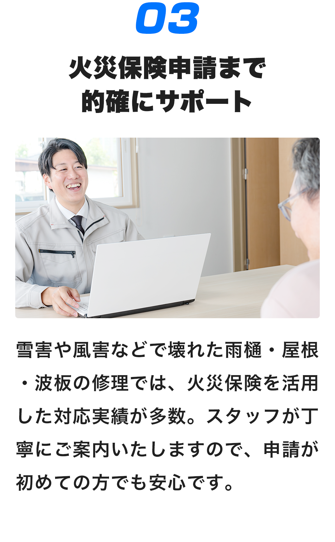 はい。雪や風で壊れた雨樋・屋根・波板などは火災保険の対象になる場合があります。当社では申請サポートの実績も豊富です。