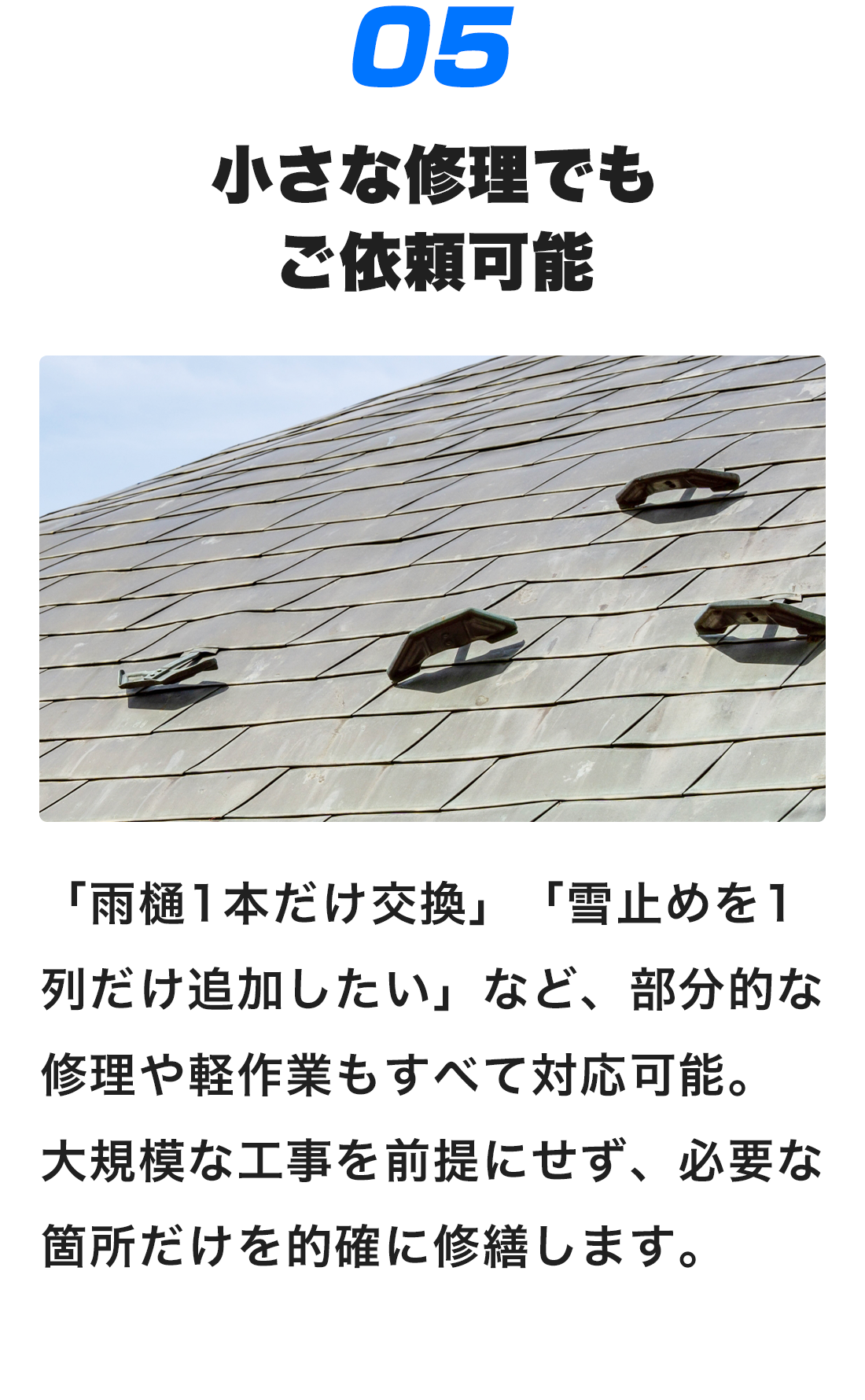 もちろん可能です。「雨樋1本だけ交換」「部分的に掃除してほしい」など、小工事にも柔軟に対応しています。